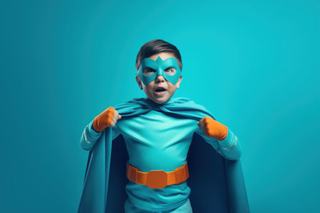 Joyful Child superhero on a cyan background. Masquerade costume of a superhero