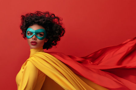 Fashion studio portrait of a young woman wearing a superhero costume with flowing cape and mask against a vibrant red backdrop