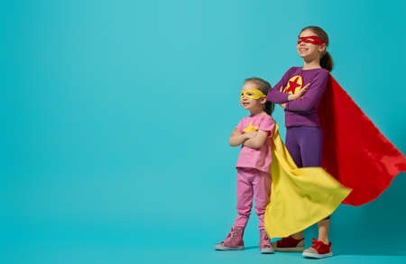 Little children are playing superhero. Kids on the background of bright wall. Girl power concept.