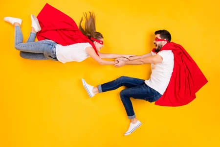 Top view above high angle flat lay flatlay lie view concept of his he her she funny cheerful cheery superheros flying having fun isolated on bright vivid shine vibrant yellow color background