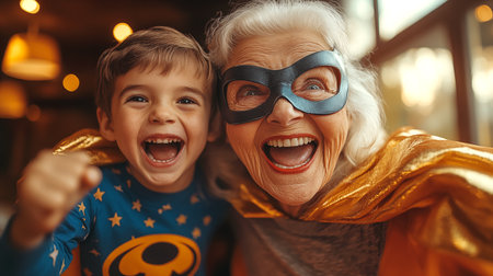 Superhero grandfather and little girl in superhero costume taking selfie at home