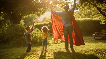 Generative AI : Optimistic smiling family in casual wear and red superhero cloaks having fun together while parents holding cheerful children on shoulders and kids pretending to be