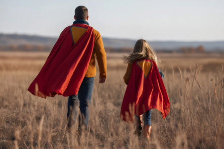 Father and his little daughter wearing red superhero capes walking together in a dry field, towards the horizon