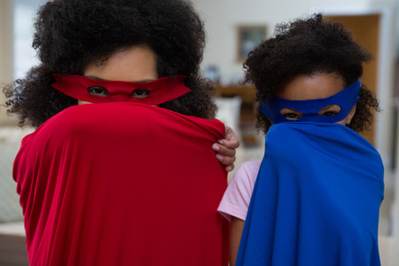Mother and her child playing together. Girl and mom in Superhero costumes. Mum and kid having fun and smiling. Family holiday and togetherness.
