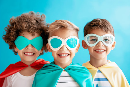 Three joyful children pose as superheroes in colorful costumes, showcasing their imagination and spreading delight in this playful moment filled with laughter