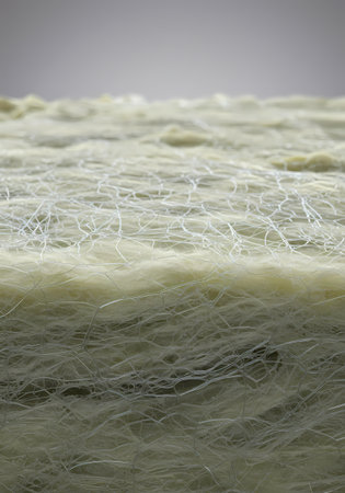 Thermal insulation material, rock wool. Thermal roof insulation layer. Mineral wool or mineral fiber, mineral cotton, mineral fibre, glass wool, MMMF, MMVF. Fiber thermal insulation close-up.