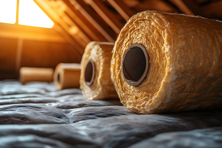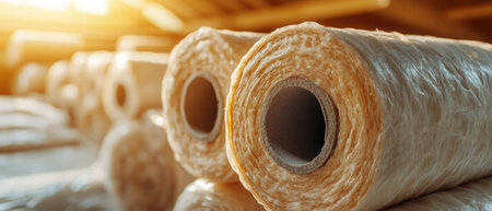 Rolls of thermal insulation material placed in a rustic attic bask in the warm glow of sunset. ideal for eco-conscious homeowners or contractors focusing on energy-efficient building solutions and sustainable living environments. Generative AI