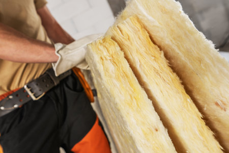 Mineral Wool Insulation by Professional Insulating Worker. Caucasian Construction Worker in His 30s.