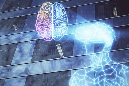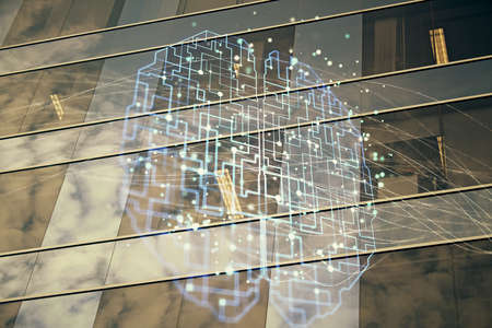 Brain hologram drawing on city scape background Double exposure. Brainstorming concept.