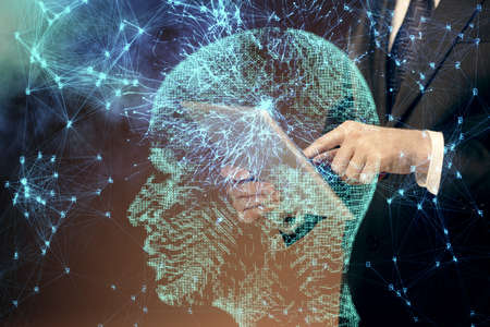 Double exposure of mans hand holding and using a digital device and brain hologram drawing. Data concept.