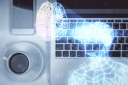 Multi exposure of brain sketch hologram over topview work table background with computer. Concept of big data.