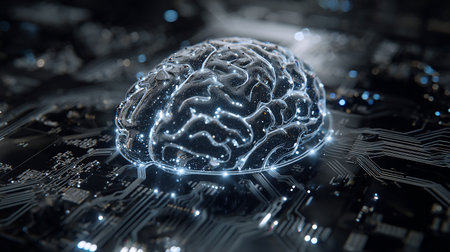 Artificial intelligence brain glowing on circuit board in laboratory at night
