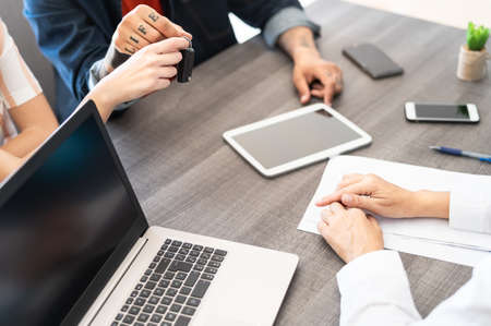 Customers couple buying new car in showroom office - Seller agent doing vehicle leasing deal contract - Work occupation and trade concept