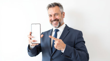 A cheerful man in a tailored suit proudly displays a smartphone, pointing at the screen with enthusiasm, radiating positivity and readiness to engage.