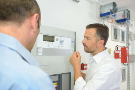 Security guard monitoring modern CCTV cameras in surveillance room. Group of security guards in surveillance room.