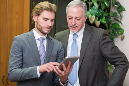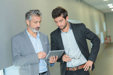 business partners working in hallway with electronic tablet