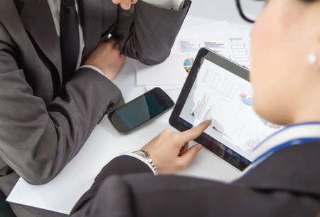 Businesswoman showing financial charts and documents in a digital tablet to the company boss