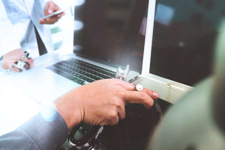 Medical technology network team meeting concept. Doctor hand working smart phone modern digital tablet laptop computer, sun flare effect photo