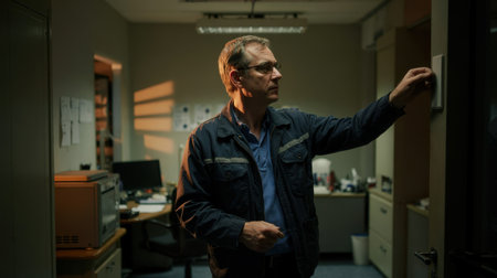 A man in a dark blue work jacket is turning on a light switch in a dim office, illuminated by slanted sunlight through the windows. The space contains office equipment and paperwork.