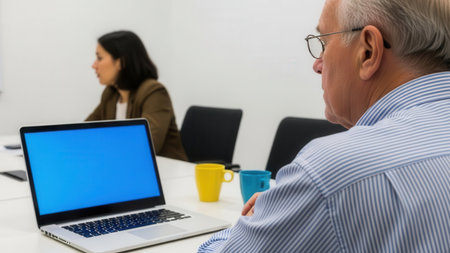 Two business colleagues in a meeting room, one presenting on a laptop, the other observing, fostering a productive work environment for strategic planning.