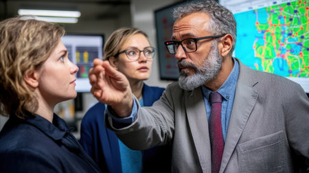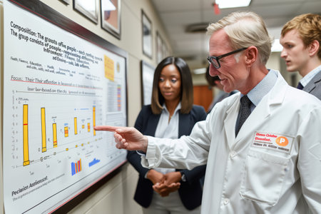 A scientist in a lab coat points at a chart on the wall, explaining data to colleagues who listen attentively, representing collaborative research, scientific analysis, and the quest for knowledge.