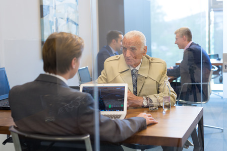 Young financial advisor sitting in front of laptop, consulting senior client with his investment strategy. Business people on business meetings.