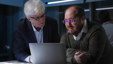 Executive and employee discuss project on laptop in office working late