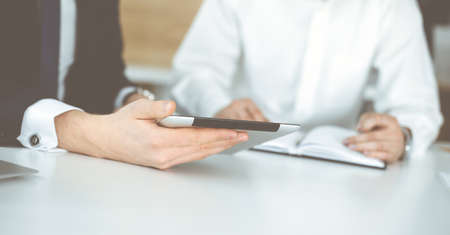 Unknown business people using tablet computer in modern office. Businessman or male entrepreneur is working with his colleague at the desk