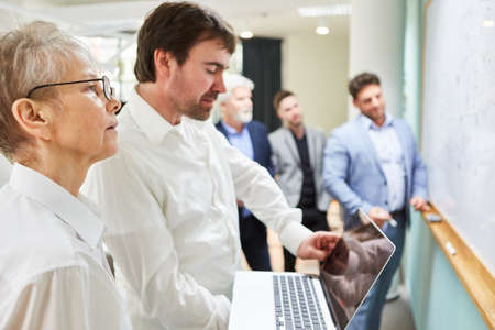 Two business people on a laptop PC planning a project in a brainstorming seminar
