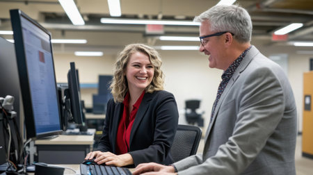 Two colleagues share a light moment while consulting on a project at their office workstation, fostering teamwork and positive interaction in a lively atmosphere.