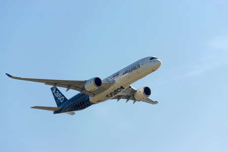 Zhukovsky, moskow region, Russia - August 31, 2019: Airbus Industrie A350 modern civil airliner taking off for a demo flight in Zhukovsky during MAKS-2019 airshow.