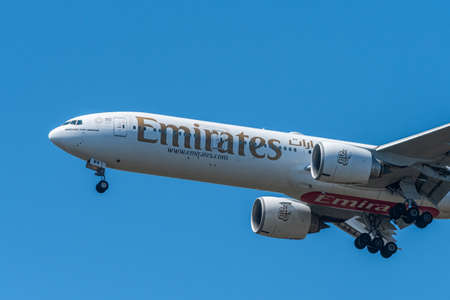 London, United Kingdom - February 2020: Emirates Airline aircraft on runway of London Heathrow airport. Emirates is an airline based in Dubai, United Arab Emirates.