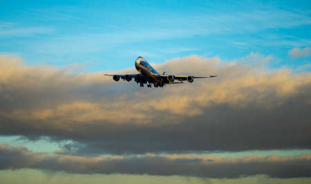 Fiumicino;Italy September 26; 2018 : A beautiful Korean Air's airplane model Boeing 747-8B5 ready to landing in Fiumicino International Airport in a Rome s sunny day.