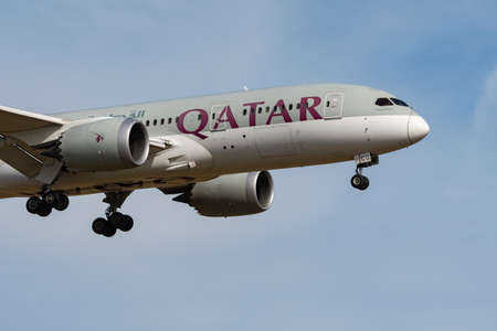 Zurich, Switzerland, February 24, 2022 Qatar Airways Boeing 787-8 Dreamliner aircraft on its final approach on runway 14
