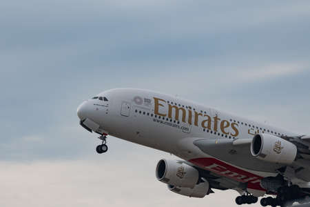 Zurich, Switzerland, March 2, 2022 Emirates Airbus A380-861 aircraft is taking off from runway 16