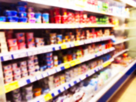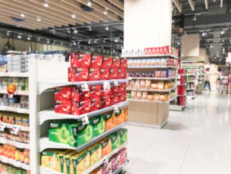 Abstract blurred food and drink on shelf in supermarket with bokeh