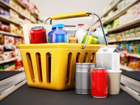 Shopping basket standing on supermarket counter. Supermarket shopping concept. 3D illustration.