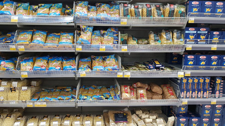 Russia, St. Petersburg 24.03.2020 Pasta in the supermarket during the coronavirus epidemic