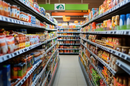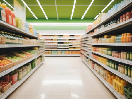 Aisle in a modern supermarket with various products on shelves. Perfect for shopping, retail, and grocery themes.