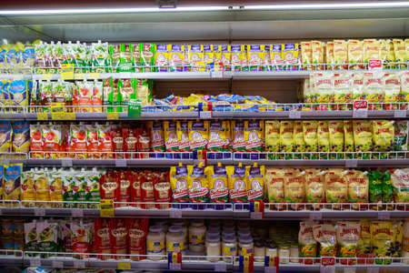 KUALA LUMPUR, MALAYSIA - MAY 04, 2020: Variety of dairy, energy drinks, soda, soft drinks, fruit juice, non-carbonated, in bottles and cans at grocery store supermarket. Beverages industry.