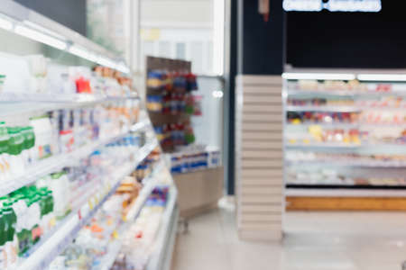 Abstract blurred supermarket store and refrigerators in department store. Interior shopping mall defocused background. Business food. Bokeh light background. Blur supermarket. Drink zone concept