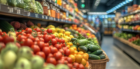 Vibrant display of fresh vegetables and fruits in an organic grocery store interior
