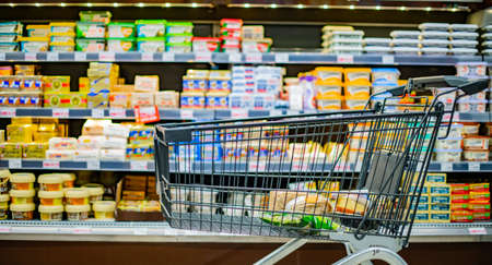 Background and wallpaper of shopping cart in supermarket departmentstore for choosing and buying grocery things at shelf. Time for shopping household goods, snacks, food, fruit, beverages and other.