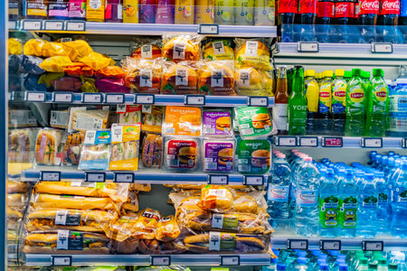 POZNAN, POL - MAR 12, 2022: Pre-packaged food and drinks displayed in a commercial refrigerator in a convenience store