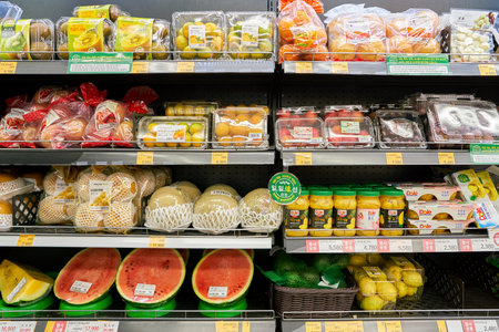 BANGKOK, THAILAND - NOVEMBER 30 : fresh organic vegetables and fruits for sale on stand or shelf in Tops Supermarket on November 30, 2016 in BANGKOK, Thailand.