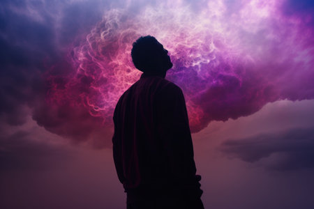 Man dreaming, silhouette of a man on magenta sky, AI generated