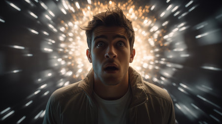 A man expressing surprise and wonder against a backdrop of dynamic light streaks