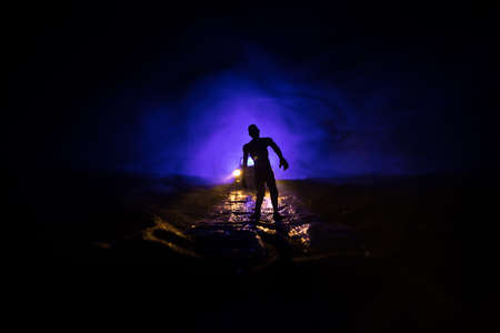 photo of a car stopped on the road lighting up a zombies. Silhouette terrible zombie night near the car. Miniature decoration. Selective focus