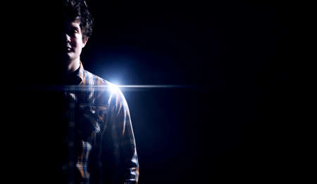 Silhouette of a young man in a dark room with light