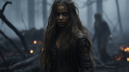 the photo showcases a 720p version of the forest of secrets 2 in the style of robert kirkman. it depicts rural life with a smokey background, featuring large-scale photography. the image includes illustrations of psychological phenomena and realistic human figures, creating a halloween-themed atmosphere. ai generated